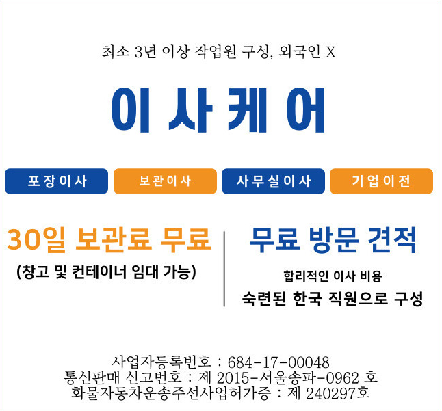보관이사,포장이사,사무실이사 전문 이사케어 브랜드 비용이 빠진 합리적 비용, 20년 이상 경력의 소장님을 주축, 최소 3년 이상 직원분들로 구성, (외국인X), 자체 컨테이너 보관 창고 운영 비용 5톤 포장이사 최저 110만원 6톤 포장이사 최저 130만원 7.5톤 포장이사 최저 155만원 10톤 포장이사 최저 200만원 * 인원,옵션,거리 및 월말,주말 추가비용 발생 사무실 이전 협의 * 전화 상담 및 무료 방문 견적 보관이사시 협의 * 현재 30일 미만 보관료 무료 보관창고 위치 이사케어 경기도 광주시 쌍령동 285 지도에서 보기 전화번호 02-1833-8624 사무실위치 이사케어 서울특별시 송파구 송파대로 260 제일오피스텔 506호 지도에서 보기 전화번호 02-1833-8624 예약문의 문의 남겨주시면 신속히 회신 드리겠습니다.
